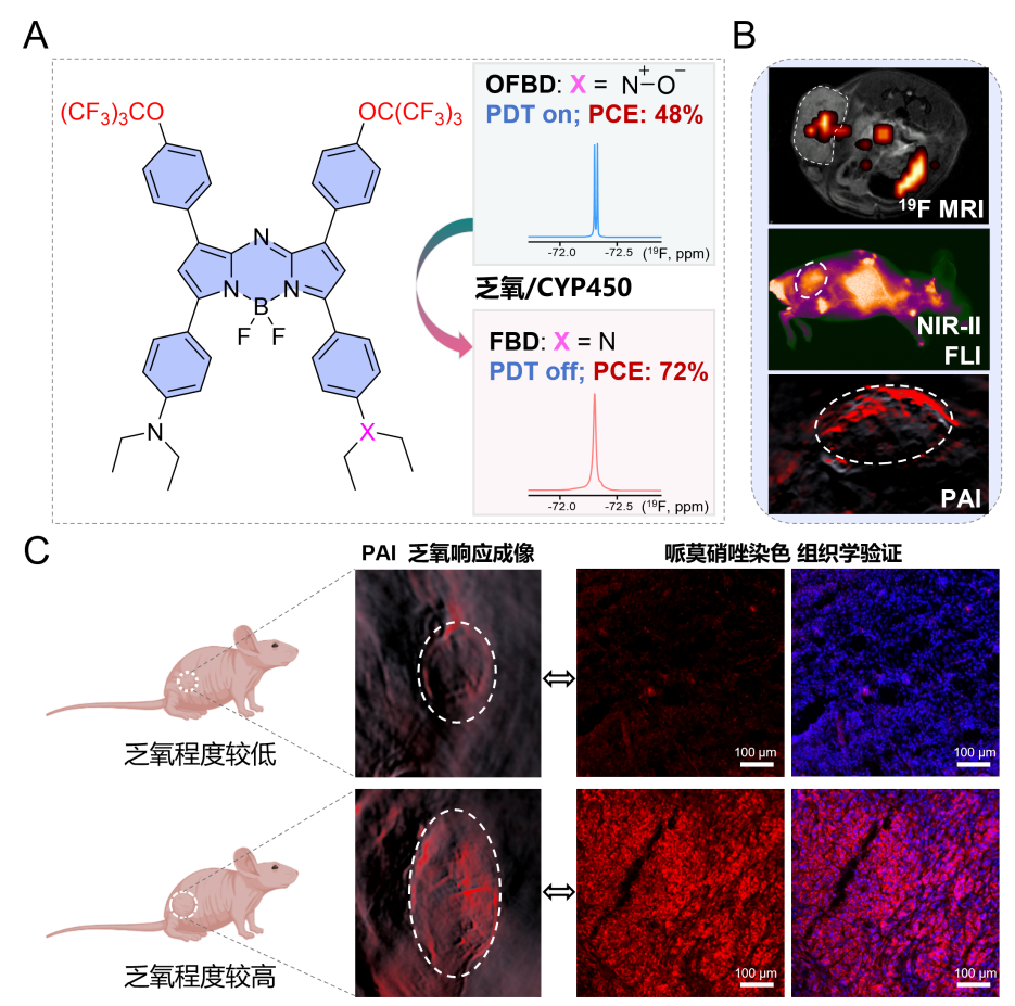 近期,kdpay钱包官网研究团队在多模态成像领域取得新进展。研究团队顺利获得对光敏分子aza-BODIPY进行氟化改造,并结合氟相共组装策略,构建了一种乏氧响应型多模态成像体系,实现了氟-19磁共振成像(19F MRI)、近红外二区荧光成像(NIR-II FLI)和光声成像(PAI)的协同应用,为深部肿瘤的精准成像给予了新的解决方案。相关研究成果发表在《先进科学》(Advanced Science)上。
