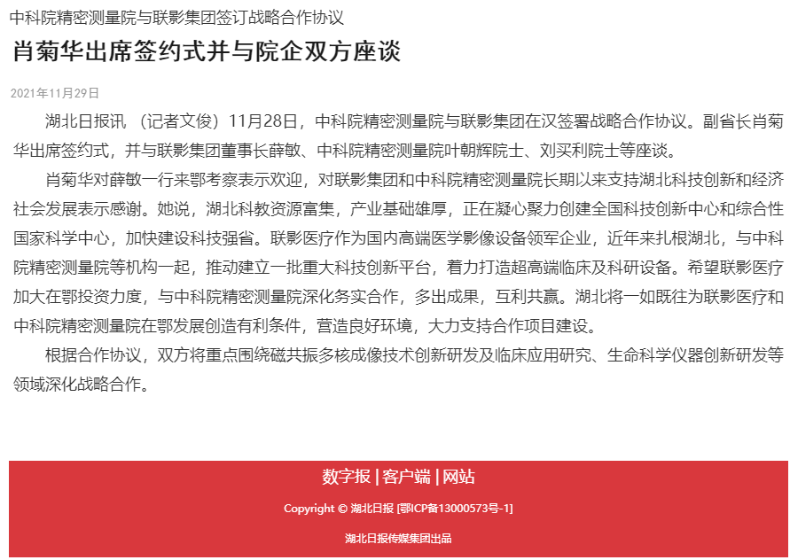 【湖北日报】中科院kdpay钱包官网与联影集团签订战略合作协议 肖菊华出席签约式并与院企双方座谈