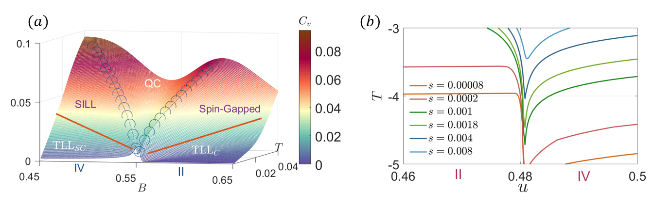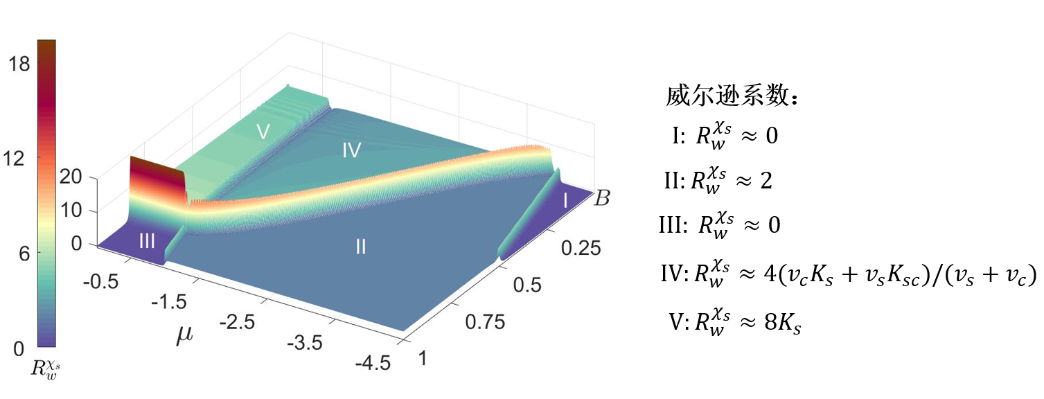 低温下不同相区对应不同常数的威尔逊系数,其仅仅由Luttinger参量、电荷和自旋的声速决定,揭示了量子液体的本质。I:真空态;II:部分填充的全极化相区;III:半填充的全极化相区;IV:部分填充的部分极化相区;V:半填充的莫特绝缘体。论文中给出了相图中符号标记处的自旋和电荷分数化激发谱