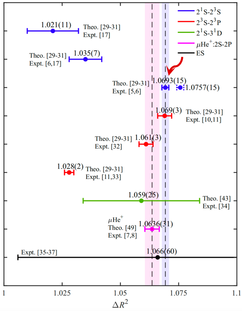 此前,基于氢原子与缪氢原子光谱测量所确定的质子电荷半径存在显著差异,“质子半径之谜”已困扰学界近十五年。近年来,在氢原子体系中,不同实验测得的质子半径结果日益分化,其成因始终未明。氦核系统也面临着类似的难题。
